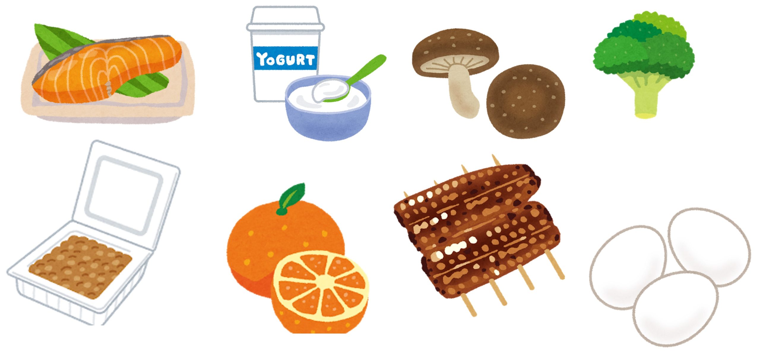 まずは、毎日のおやつの代わりにみかんを1こ、朝食に納豆と卵を食べる、お昼はブロッコリー、夕食にはキムチなどの漬物を食べる、お日様が出たら外に出るなどの習慣をつけていただくとよいと思います!